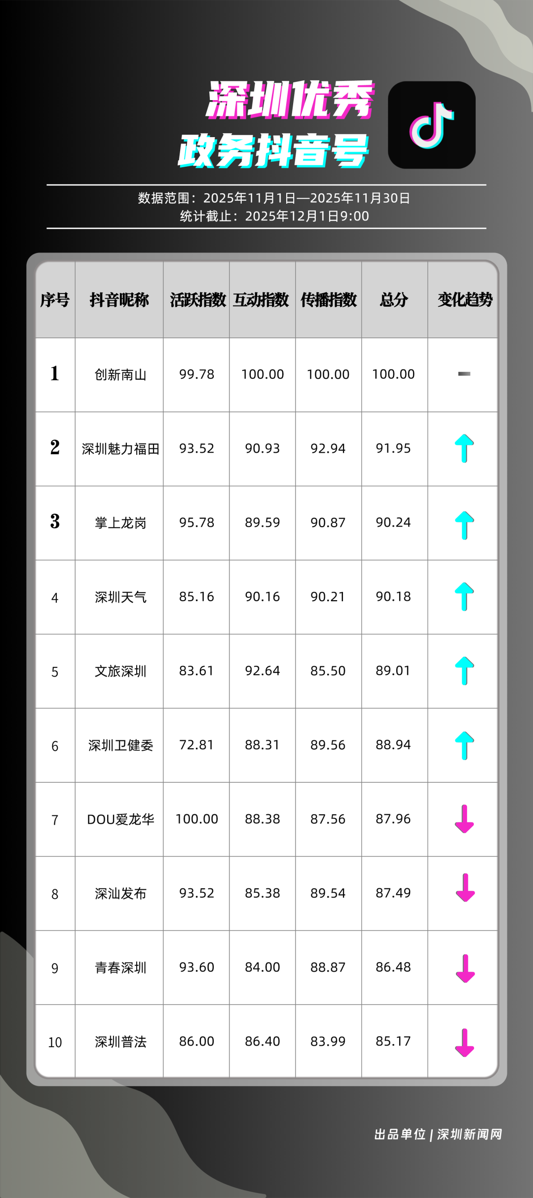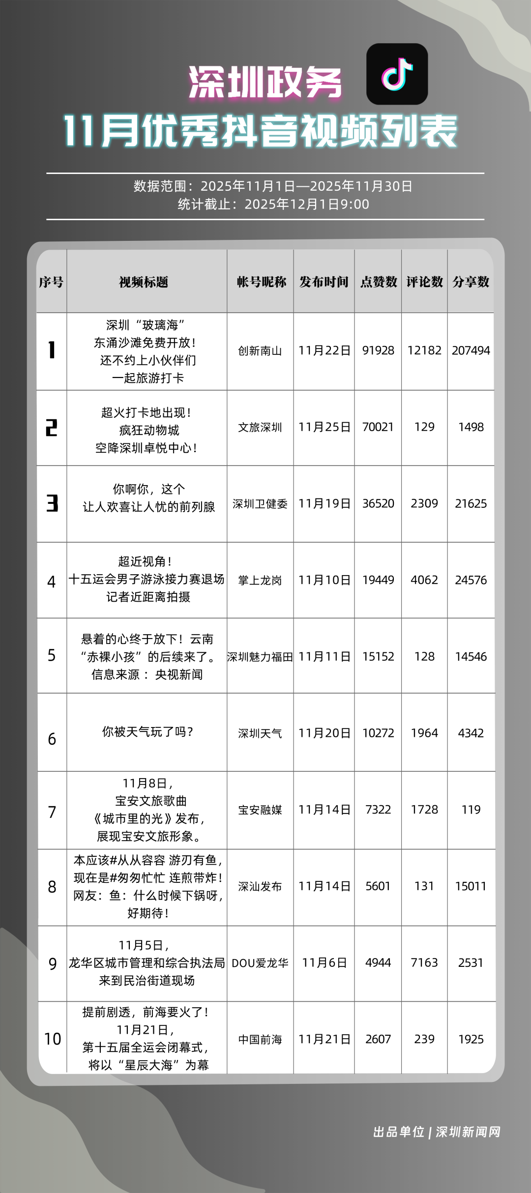 11月,獲得“優(yōu)秀政務(wù)抖音號”稱號的是“創(chuàng)新南山”“深圳魅力福田”“掌上龍崗”“深圳天氣”“文旅深圳”“深圳衛(wèi)健委”“DOU愛龍華”“深汕發(fā)布”“青春深圳”“深圳普法”?!皠?chuàng)新南山”多篇文旅、健康及出行相關(guān)內(nèi)容分享超10萬次,在互動、傳播方面表現(xiàn)亮眼,蟬聯(lián)榜首;“深圳魅力福田”在各方面指數(shù)評分較為均衡,位列第二名;“掌上龍崗”在活躍指數(shù)得分較高,能夠較好均衡內(nèi)容數(shù)量與質(zhì)量,位居第三,排名較上期有所提高?!吧钲谔鞖狻薄拔穆蒙钲凇钡荣~號緊隨其后,得分均在90分上下。上榜優(yōu)秀政務(wù)抖音號通過深耕內(nèi)容創(chuàng)作,收獲了高點贊、高分享的傳播效果,也推動評論區(qū)形成正向互動生態(tài),最終以優(yōu)質(zhì)內(nèi)容為核心載體,增強政務(wù)賬號影響力。