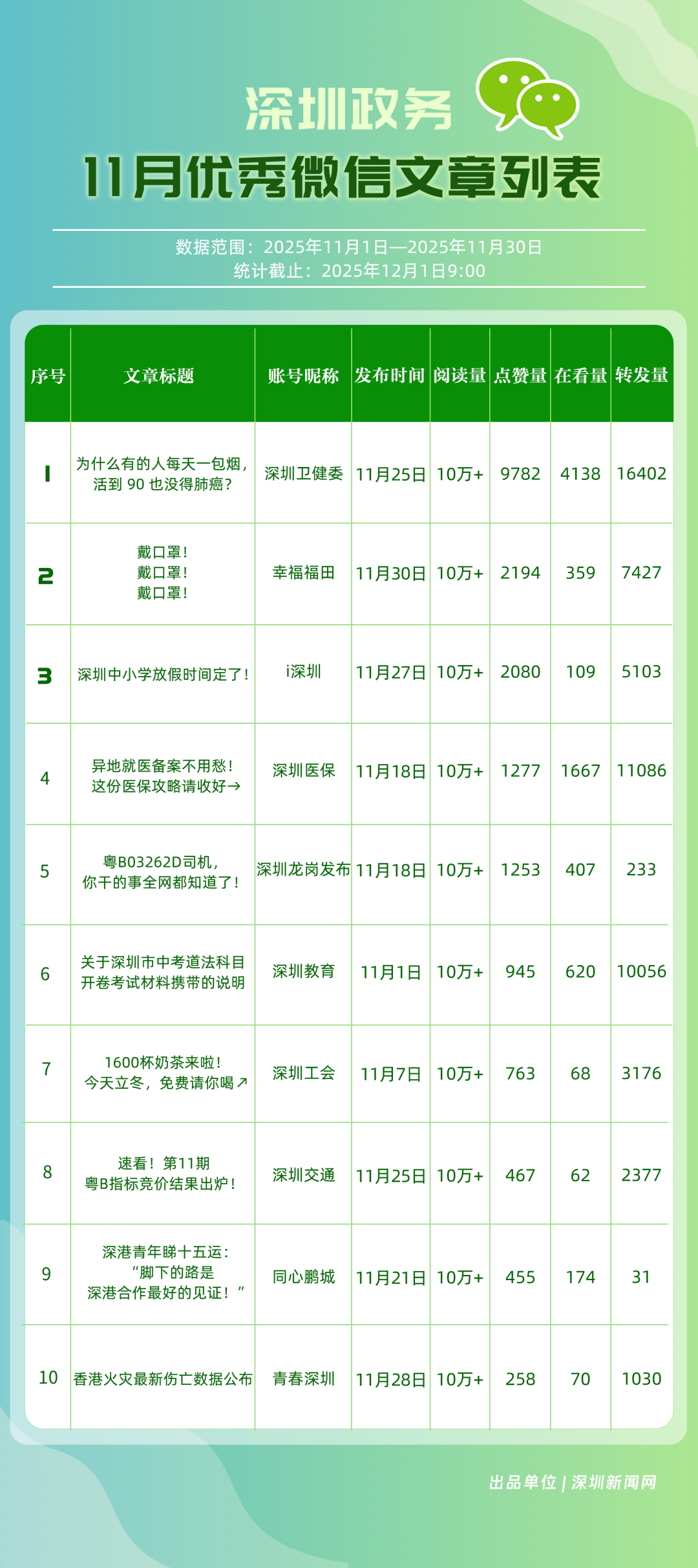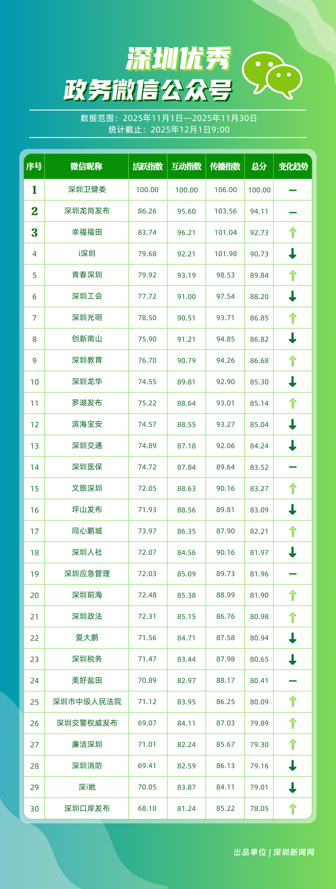 11月,“深圳衛(wèi)健委”“深圳龍崗發(fā)布”“幸福福田”“i深圳”“青春深圳”“深圳工會”“深圳光明”“創(chuàng)新南山”“深圳教育”“深圳龍華”等30個政務(wù)微信公眾號榮登“深圳優(yōu)秀政務(wù)微信公眾號”榜單。11月,“深圳衛(wèi)健委”在活躍、互動、傳播方面均取得較好成效,以滿分位于榜單首位;“深圳龍崗發(fā)布”在傳播、互動指數(shù)得分較高,十余篇文章閱讀量超10萬次,位居榜單第二;“幸福福田”持續(xù)發(fā)布優(yōu)秀內(nèi)容,排名第三?!癷深圳”“青春深圳”“深圳工會”等政務(wù)賬號在信息發(fā)布中拓展信息維度、深化服務(wù)場景,評分在88分以上。上榜微信公眾號以高質(zhì)量內(nèi)容為核心抓手,在政務(wù)傳播賽道樹立了標(biāo)桿形象,成為兼具影響力與公信力的典范。
