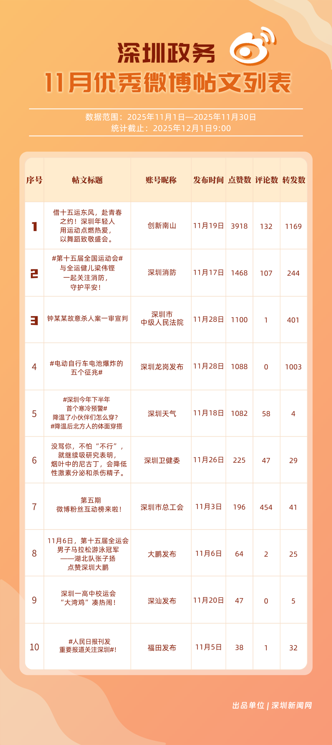 11月,20個賬號入選“優(yōu)秀政務(wù)微博號”榜單,其中包括:“深圳天氣”“深圳市總工會”“深圳龍崗發(fā)布”“創(chuàng)新南山”“福田發(fā)布”“深圳消防”“深圳衛(wèi)健委”“深汕發(fā)布”“深圳公安”“深圳應(yīng)急管理”等。其中,“深圳天氣”高頻次發(fā)布天氣類信息,受到網(wǎng)民肯定,蟬聯(lián)榜首;“深圳市總工會”發(fā)布互動抽獎、十五運等多元內(nèi)容,排名提升至第二;“深圳龍崗發(fā)布”在傳播指數(shù)獲得較高得分,助力其位列第三。上榜優(yōu)秀政務(wù)微博賬號以優(yōu)秀內(nèi)容提升賬號競爭力,贏得公眾認(rèn)可,實現(xiàn)了政務(wù)信息的有效傳播,為政務(wù)新媒體的內(nèi)容運營與價值傳遞提供參考。