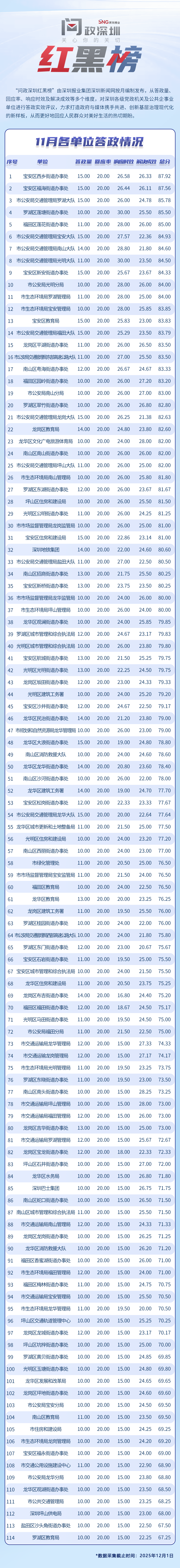 為探尋媒體如何精準賦能基層治理現(xiàn)代化的“深圳路徑”,深圳報業(yè)集團正式掛牌成立“問政深圳”工作室,旨在進一步推動網(wǎng)絡問政工作的高效開展。為確保相關工作更加契合實際需求,深圳報業(yè)集團深圳新聞網(wǎng)按照“最快速度辦結”的總體要求,將原有月度榜單創(chuàng)新升級為“問政深圳紅黑榜”,并對評分體系進行了細致優(yōu)化。該榜單從答政量、回應率、響應時效及解決成效等多個維度,對深圳各級黨政機關及公共企事業(yè)單位進行答政實效評議,力求打造政府與媒體攜手共進、創(chuàng)新基層治理現(xiàn)代化的新樣板,從而更好地回應人民群眾對美好生活的熱切期盼。