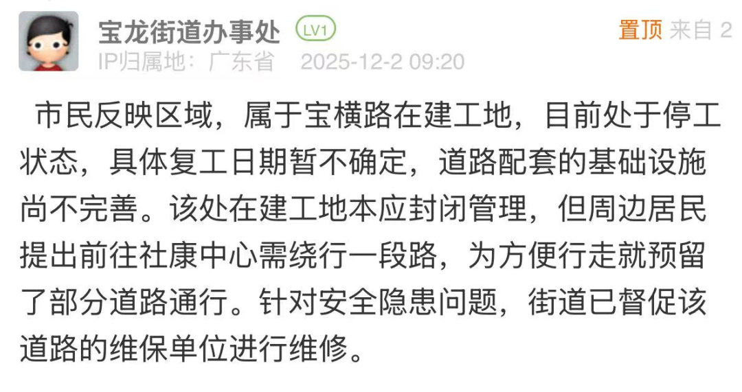 優(yōu)化建議:針對市民反映的道路在建工地預留道路路燈暗淡、路磚碎裂等問題,帖文回應存在“解釋多、舉措少”的短板,未能化解群眾多次投訴無果的不滿。同時,“復工日期暫不確定”的表述易引發(fā)市民的疑惑與不滿,后續(xù)有市民在評論區(qū)反饋該道路仍未啟動維修工作,建議責任單位主動協(xié)同項目建設、施工等責任主體,明確給出復工的預估時間或階段性處置方案及臨時性保障措施,推動問題解決。