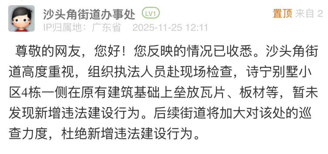 優(yōu)化建議:針對網(wǎng)民投訴的小區(qū)違建問題,街道回應僅以“未發(fā)現(xiàn)新增違法建設行為”簡單回復,尚有完善空間。若該點位存在建設年代久遠、權屬界定模糊、涉及多主體協(xié)調等客觀難點,可適度說明,并在回應中補充核查細節(jié),說明后續(xù)處置方向與階段計劃,讓回應更具可信度和實操性,回應市民對“依法履職”的期待。