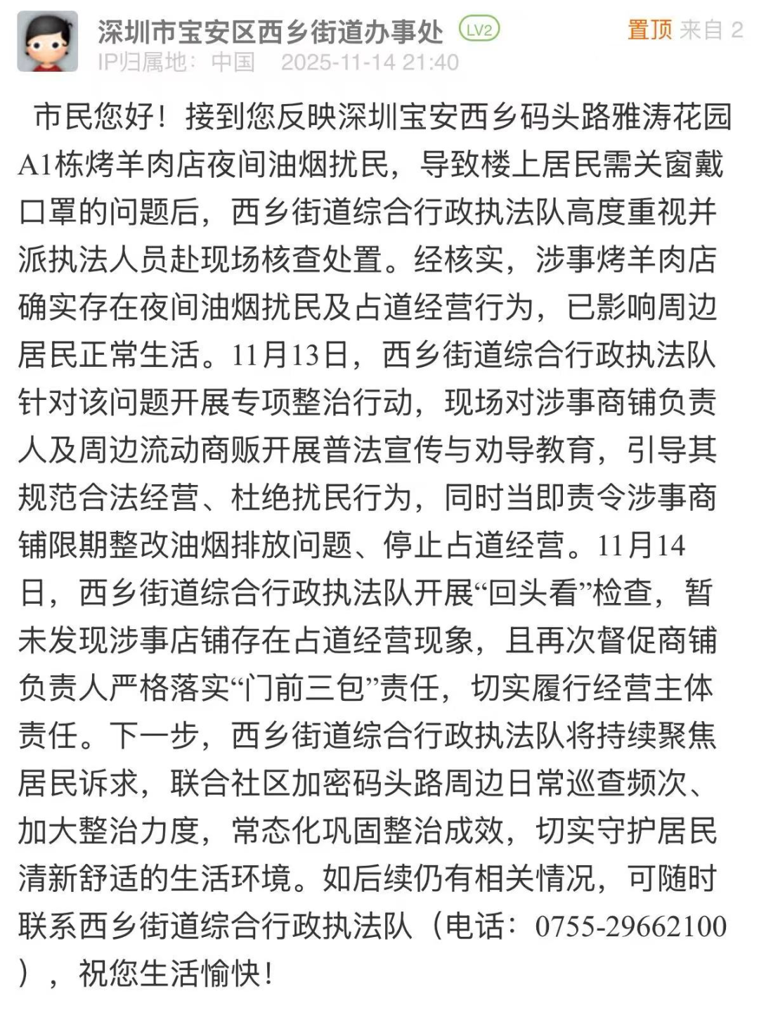 案例點評:接到市民反映后,街道迅速響應,當日開展核查,次日回應進展,處置高效。針對涉事店鋪油煙問題,執(zhí)法隊不僅現(xiàn)場開展普法勸導,責令商鋪限期整改,更在次日開展“回頭看”檢查,及時跟進整改進度、壓實經(jīng)營主體責任?;貞?,街道明確下一步將聯(lián)合社區(qū)加密日常巡查、加大整治力度,常態(tài)化鞏固整治成效,體現(xiàn)出緊盯民生痛點、深耕基層精細化治理、全力守護居民舒適生活環(huán)境的決心。