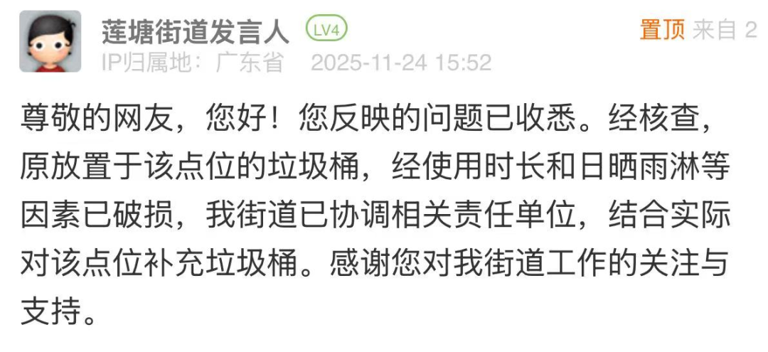 案例點評:針對市民反映“垃圾桶無故取消”的問題,街道辦在3小時內完成核查,清晰說明垃圾桶搬離原因,同時迅速協(xié)調相關責任單位,結合實際情況明確將為該點位補充垃圾桶,切實解決群眾投放垃圾的剛需。此次處置迅速有效,既體現(xiàn)了直面民生訴求、不推諉不拖延的工作態(tài)度,也展現(xiàn)了精細化治理能力,為后續(xù)環(huán)衛(wèi)設施維護和民生需求響應提供了范本。