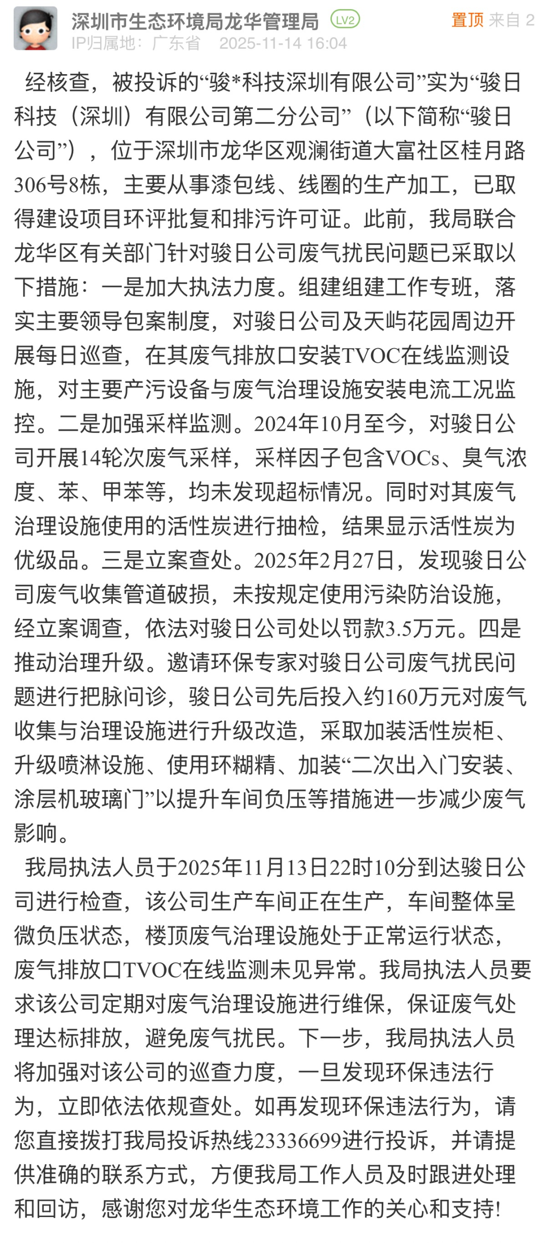 優(yōu)化建議:針對市民反映的工業(yè)廢氣擾民問題,相關部門雖采取巡查監(jiān)測、立案查處、推動設備升級等舉措,但未能實質性化解居民困擾。在該問政網(wǎng)帖的評論區(qū),有多位業(yè)主留言反映,近一年來“天天聞到臭氣”,并對“采樣均未發(fā)現(xiàn)超標情況”的回復表示質疑。建議相關部門在依托專業(yè)設備檢測的同時,結合居民“嗅辨”反饋開展精準溯源,切實回應群眾對清新環(huán)境的基本訴求,推動治理從“數(shù)據(jù)達標”轉向“群眾滿意”。